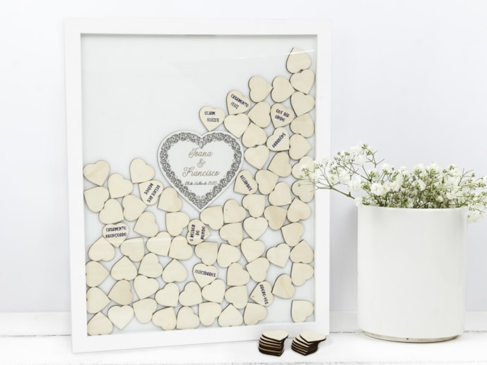 Guarde para sempre as lindas mensagens dos seus convidados com este quadro composto por 100 corações de 4.5X0.3CM, personalizado com o vosso nome e data do casamento.